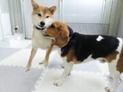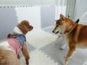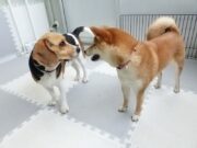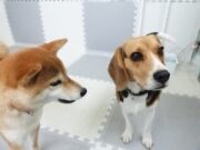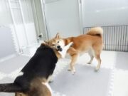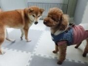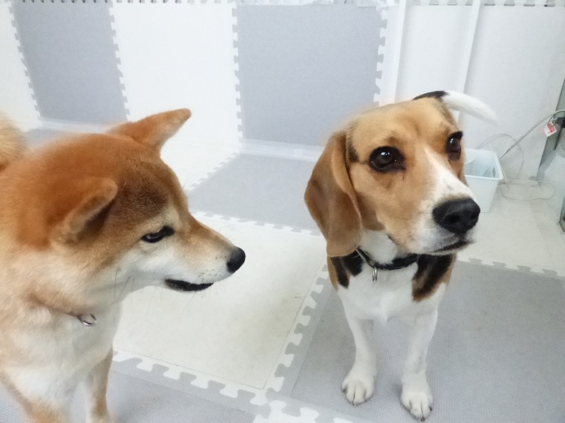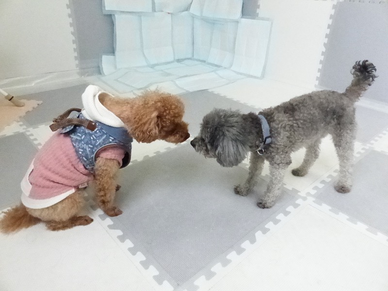 見つめ合うマロンちゃんとむぎちゃん。